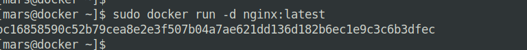 setelah selesai mengambil images nginx, jalankan images dengan options -d yang artinya menjalankan images di daemon atau background secara otomatis.[mars@docker ~]$ sudo docker run -d nginx:latest