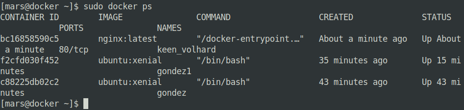 matikan terlebih dahulu container nginx :[mars@docker ~]$ sudo docker stop keen_volhard