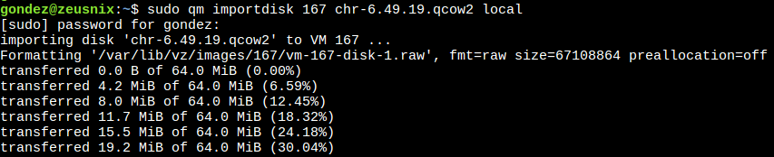 qm importdisk <VM_ID> <filename>.qcow2 <storage_pool_name>sudo qm importdisk 167 chr-6.49.19.qcow2 local