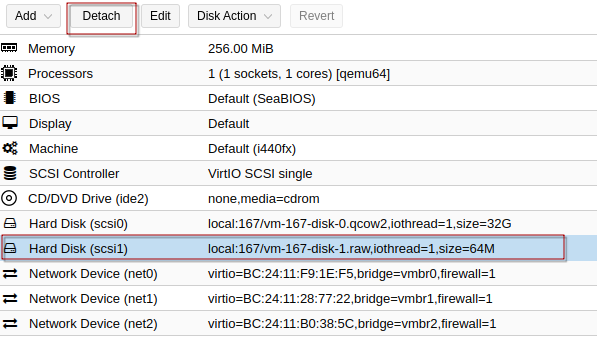 Hapus Hard Disk yang lama pada port SCSI 1, dan kemudian boot VM Mikrotik CHR, dengan memilih Hard Disk dan tombol Detach pada toolbar atas