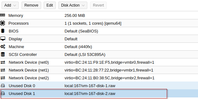 - Cek kembali pada VM ID mikrotik CHR pada bagian hardware, maka akan muncul Unused Disk yang baru saja ditambahkan.